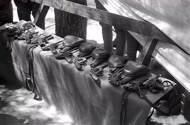 图:八路军指战员们使用的手枪,有驳壳枪、“王八盒子”(大正十四年式手枪)等。