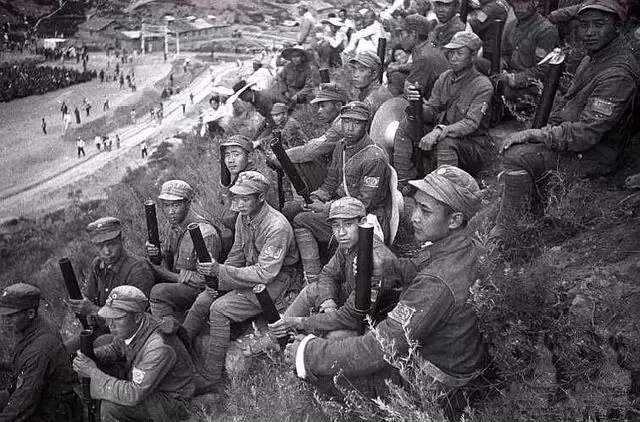 图:演习间隙,八路军战士坐在山坡上休息,人手一个掷弹筒。