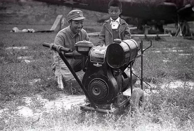 图:八路军359旅旅长王震正在观看一台燃油发电机,对于当时整个延安来说,仅此一台。这是1944年美军观察组带来的,主要为搜集日军情报,采集军事气象情报的器械发电,后送给八路军。