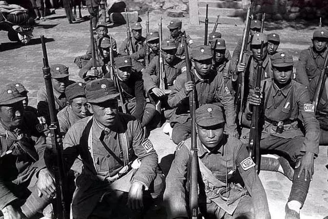 南泥湾的八路军战士们,他们即使是坐着,看起来仍然军容齐整,把枪支靠在肩膀上面,看上去真是一支能打硬仗的队伍。