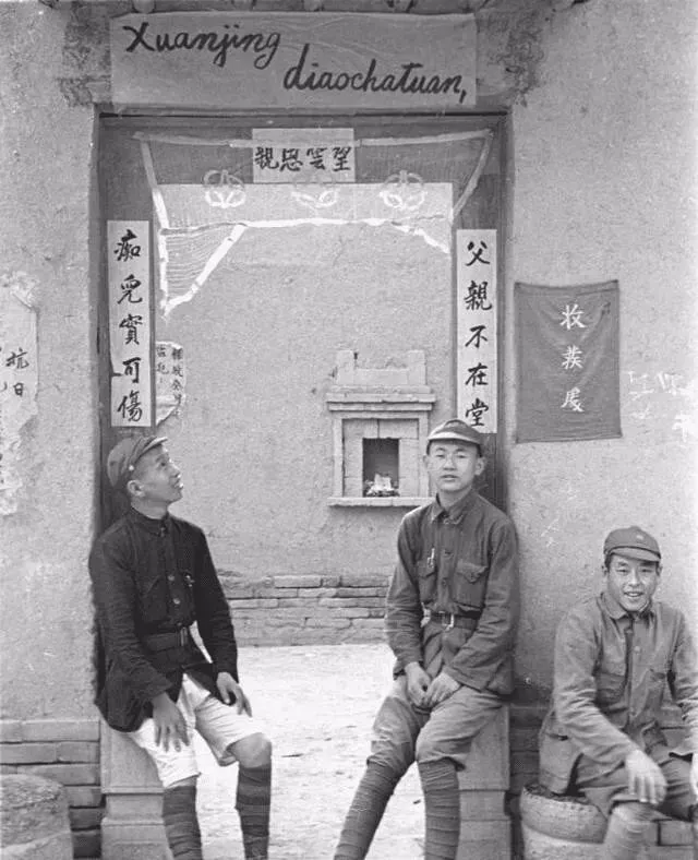 三名八路军兵士坐在门前
