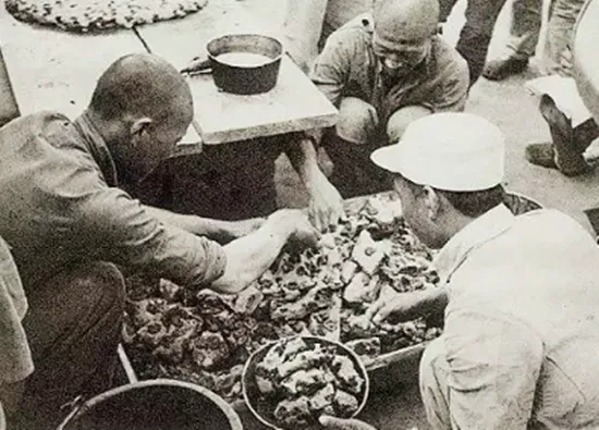 行军打仗,条件太辛苦,在过节的时候,战士们难得改善一下伙食,这是蒸的枣糕,战士们和部队的大厨正在出锅装盘。