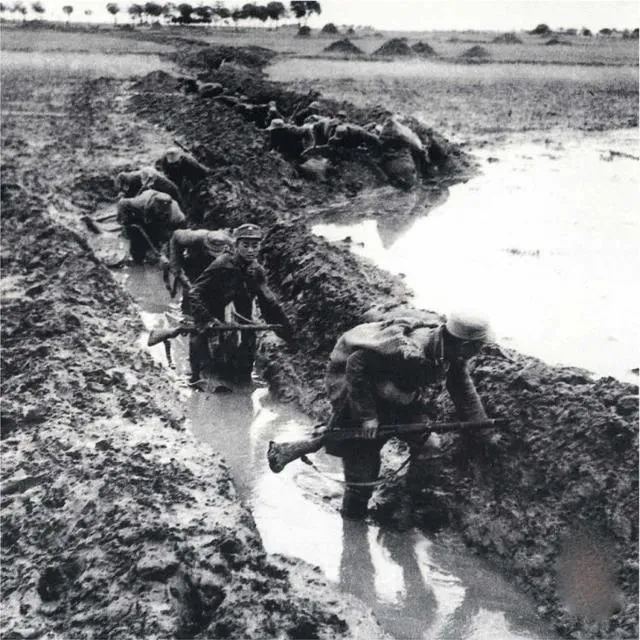 华北八路军领导的敌后战场军民的生活面貌及战斗场景。图为我军趟水奋勇攻击兴济。