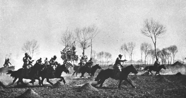 图为八路军骑兵出击迎敌。当年八路军的骑兵部队,和现如今的影视剧迥然不同。所乘战马除了部分缴获自日伪军外,还有很多农家的矮马,武器装备也是五花八门。很多情况下,步兵牵上一匹马,练习几天就算是骑兵了。
