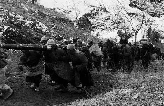 图为民兵把土炮抬到山顶上。