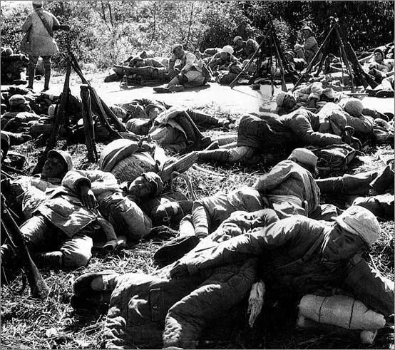 图为在反"扫荡"中,八路军艰苦转战。这是在战斗间隙中休息的部队。