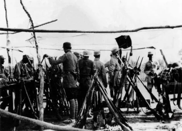 图:八路军战士们演习时休息的场景,每人配备了一把三八式步枪。