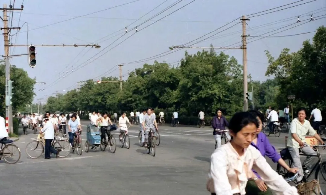 图中这一片黑压压的都是车,叫二八大梁和女式横梁的老永久老凤凰,镀铬车把亮汪汪,前篮子里爱塞布兜儿或搪瓷饭缸,早高峰一开闸,铃儿一阵接一阵,大家左臂自然搭在把上,右手攥着闸,像过江的鲫鱼一样往前涌,爸爸说那会儿去上班就认衣角儿和车铃声,远远一听是自己人,脚下加两把劲儿就追上了。