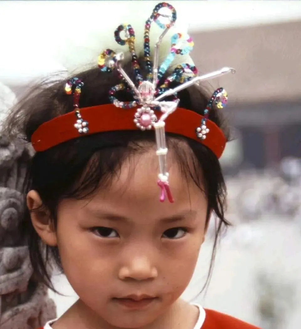这个亮晶晶的叫儿戏头面,红绒带勒在额头,细铁丝拢着彩珠和小亮片,正中垂个坠儿,一走路就晃,奶奶爱在景山门口给我买,边系边说别老拽,掉了可就没了,照相时她喊我别眨眼,我偏偏努着嘴装严肃,回头看这神情,怎么就有点逗呢。