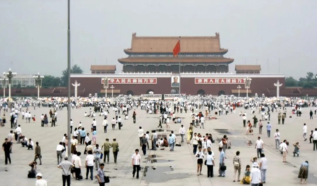 这张一看就知道在广场,旗杆正中立着,地上有雨后的小水洼,映出半截天安门城楼的影子,卖冰棍儿的小贩挑着篓,一声吆喝就被围住,兵哥哥站在一线,看着人群像潮水起伏,爸爸说以前单位组织集体照,拍完大家在地上坐成一片,半天舍不得走。
