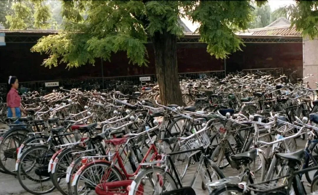 这一地儿叫自行车停车场,树荫下挤得密不透风,前梁上有铁牌号,车锁挂在后座弹簧上咔哒一声,管理员穿蓝褂子,腰里一串铜锁头叮当响,我最会的本事是记位儿,靠树根第三排红车把那儿,转一圈儿还能找回来,可见那时候“找车”也是门手艺。