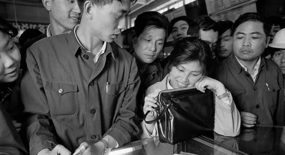 图中这只亮闪闪的皮包叫手拿包,黑色油皮面儿,细拉链,转角处有小弧度,货架玻璃映着人影,最显眼的就是那点光泽,八一年的柜台前总要排一层人,伸着脖子看,售货员戴着白袖套,算盘噼里啪啦敲着,妈妈说当年买个这样的包得攒几个月奖金,逢同学婚礼才舍得背出去,走在淮海路上别提多神气。