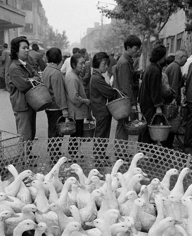 这圈圈相套的叫竹编活禽篱,篾条细密,绳口扎紧不让飞,照片里一排人提着竹篮在等,篮里垫点草根防漏粪,卖鸭的嗓门大,一手抓脚一手捏翅,往秤盘上一搁,咣当一下就知道斤数了,以前过节炖一锅老鸭汤,全家人都说香,现在小区楼下点个外卖,味儿是有,热闹劲儿却淡了。