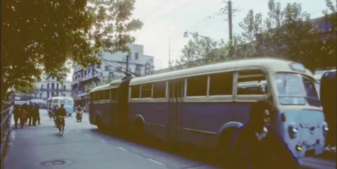 这辆长条的叫无轨电车,车顶两根集电杆咔哒咔哒顶着电线,车身中间用黑色软连接折着,转弯时像拉链开合,车门口堆满人,手拉环摇来晃去,爸爸说上班挤车是常态,能抢到窗边位置就算福气,现在地铁空调呼呼吹,手机一刷就过闸,那时可得攥好硬币和月票。