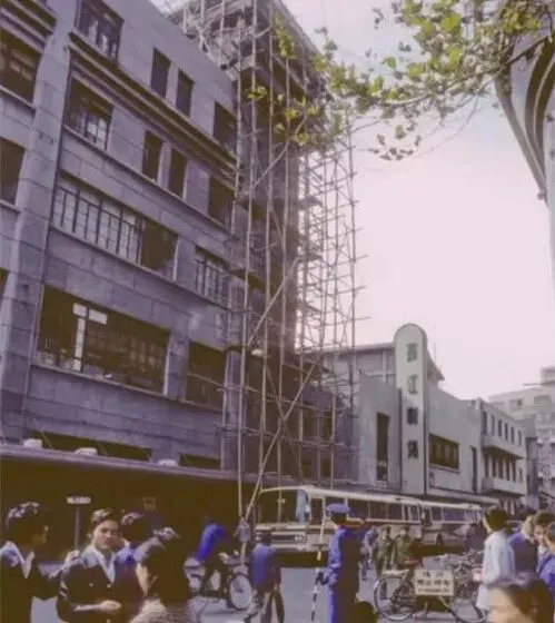 照片里的钢管脚手架直通天,绑扎着麻绳结,下面是一片蓝色工装的人流,门脸招牌是黑底白字,工地边停着长鼻子的公共汽车,师傅们收工时肩上还搭条毛巾,路人绕着走,抬头看看就聊两句几年能盖好啊,现在的高楼唰唰往上长,那时候慢点稳点,活计讲究扎实。