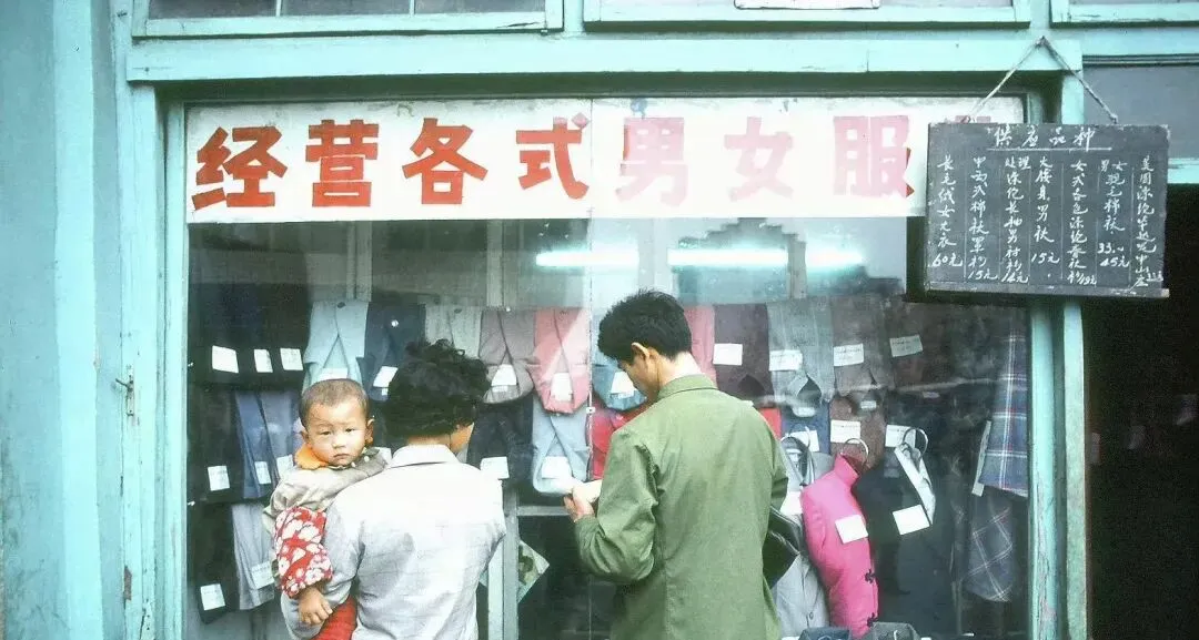 这个黑板小牌子就是当天的布料价目,粉笔写得密密麻麻,橱窗里挂着中山装面料和绒线背心,标着尺寸和成分,妈妈说那会儿买布要掂着票证去,掌柜量完尺码再剪,余头还要折给你,家里缝纫机吭哧吭哧响,邻居来借划粉和量带,做成一身新衣,照片要照,走亲戚要穿出来显摆。