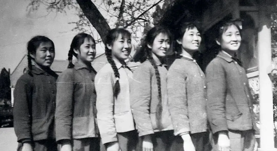 这张里最惹眼的是那一溜麻花辫,辫根紧,辫梢细,发绳多半是旧布条搓的,风一吹就打在后背上啪啪响,姑娘们侧身站,衣裳呢,粗布棉袄,袖口卷了半指长,笑着不往前冲,倒像是要憋住劲往生活里闯,我妈看见这张乐了,说当年梳辫子也有讲究,早上抹点清水,手心一搓一抹,碎发就服帖了,可这一招在现在的吹风机前啊,早就退了场。
