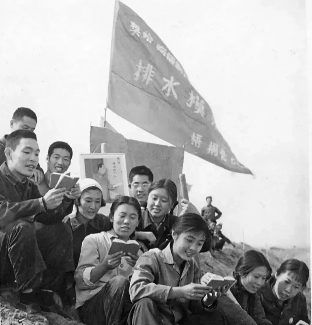这张里举着的小册子就是学习用的读本,布面封皮软塌塌的,边角起了毛,旗子在后头猎猎地响,大家蹲着坐着挤一团,谁读到激动处就用拳头点点字,嘴上“咯”一声提气,旁边的人接过一句就笑,傍晚风顺坡下去,尘土味夹着野草腥气,爷爷说那会儿最盼的就是集体念书,念完再派工,星星都看了半天,现在学习在手机上滑两下,快是快,合在一块的劲头却稀了。