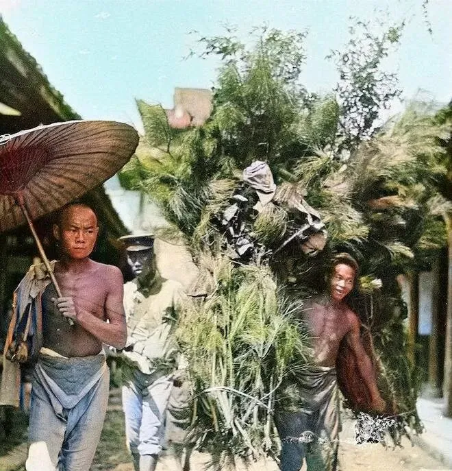 这张里头,伞下的汉子不是兵,是给兵站送草料的脚夫,肩头搭了件破布,赤膊抬头看路,身后草捆比人高一头,兵从旁边穿过去,帽子压得低低的,像是怕和人对上眼,老成都夏天闷热得很,赤膊和呢料并排走,汗味一股子往前冲,这气味就是城里的日常。