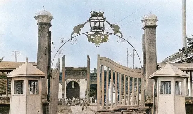 这个地方叫兵营门,铁艺拱门弯成一弧,顶上挂着灯匾,两侧的木岗亭像两只方壳子守着口,门板半开,里头人影来来去去,门柱皮壳已经起裂,电线从空里拉过去,旧城气和新式营制混在一块,站门岗的兄弟多半要在这儿来回踱步,一天能把地砖磨亮一层。