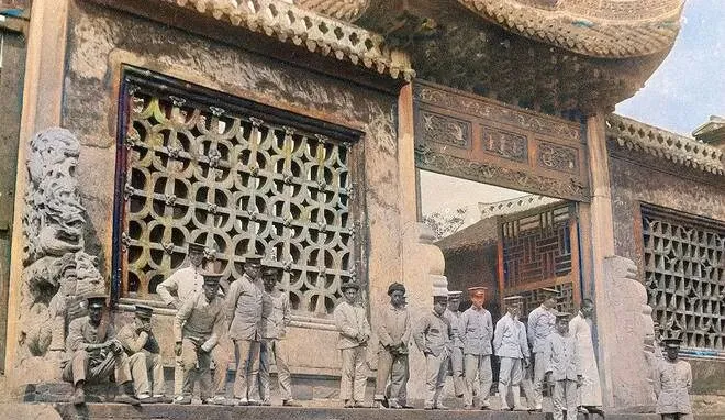 这处石台叫城内大庙前檐,窗棂镂花子密密地开着,檐下彩绘已经发灰,十来个兵靠着站着,手插兜的有,盘腿坐砖的也有,帽檐压低,看不太清眼神,我小时候最爱听外公学他们打趣,什么今天点名晚点开呀,谁又把手套洗掉色啦,笑起来像在街口吹风一样轻松。