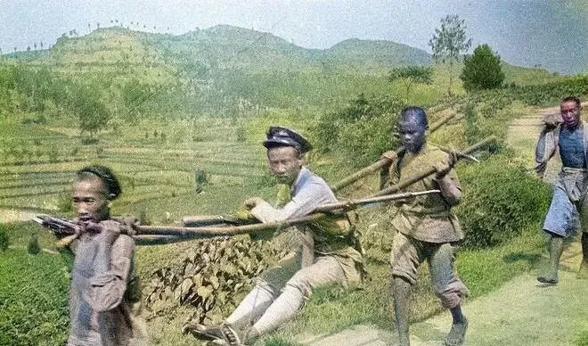 这个坐杠的叫临时抬架,前后各一个脚夫,挑的是穿军帽的主儿,枪还别在旁边,脚夫皮绳勒着肩窝,青筋一条条冒出来,那时候走山路,一脚高一脚低,兵也要借力坐会儿,外公笑我说,别看帽子一戴像个人物,真要翻山越岭还得靠民夫。