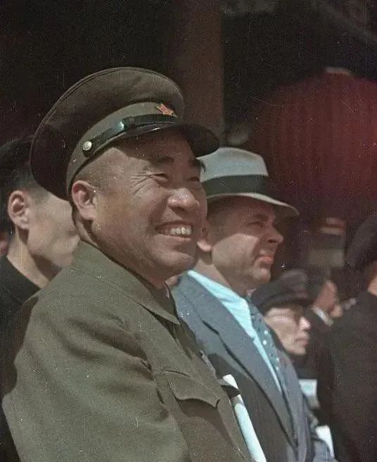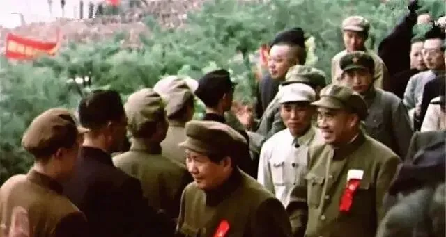 图中这段台阶口的热闹场面叫登城楼迎接,灰呢子大衣配呢帽的有,绿军装配红绶带的也有,大家一边握手一边寒暄,袖口上别着的艳红色像新鲜的枣子一样亮眼,镜头没开美颜,笑纹都是真实的,肩章铜扣在光下闪一闪,像是在说今天得记一辈子。
