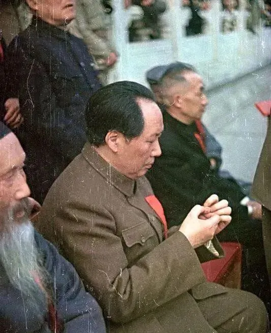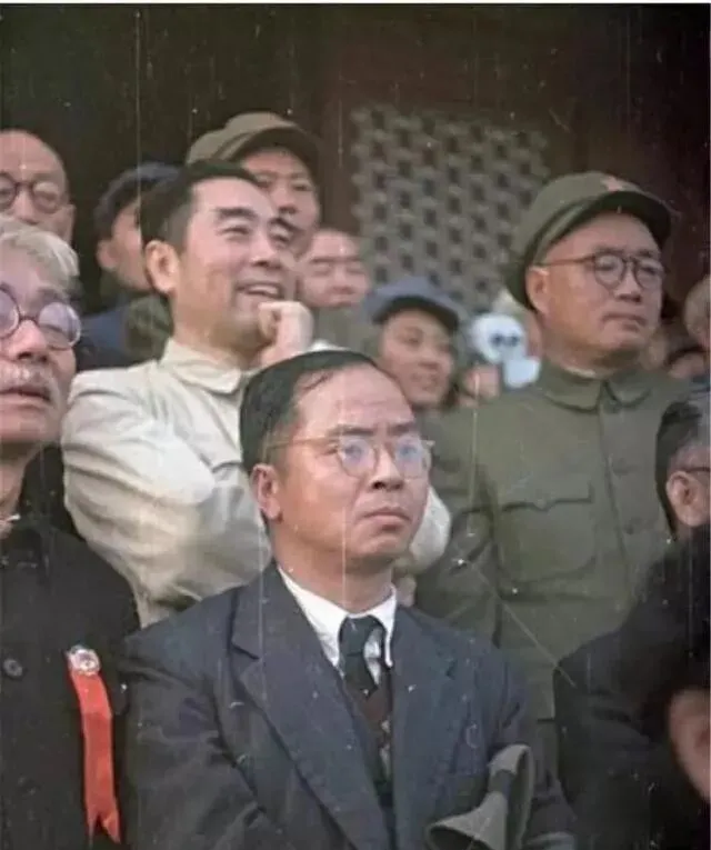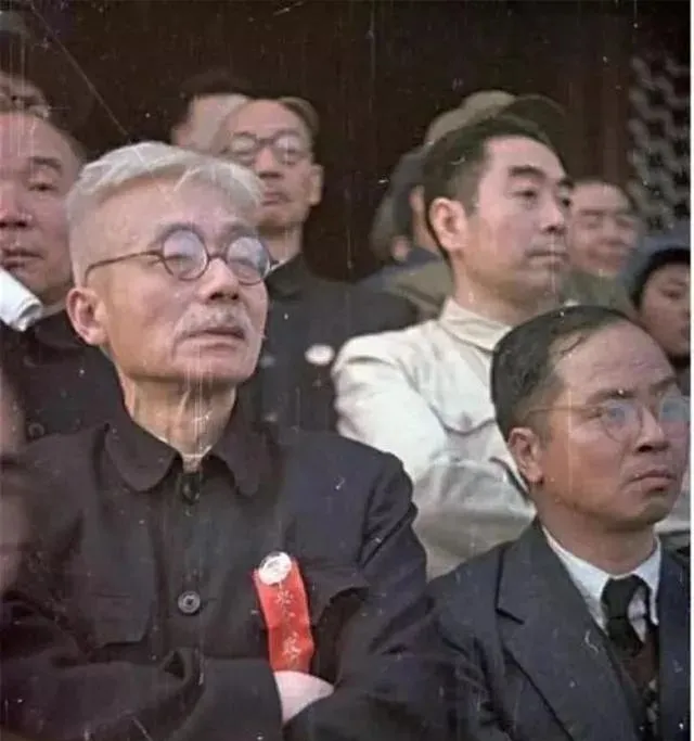 图中这位抱臂的先生神情很稳,圆框眼镜后眼神发亮,胸前的红缎带折痕清楚,老黑呢中山装摸上去八成是硬挺的粗呢料,风一停,他抬了抬下巴,像是在用心听每一个字。