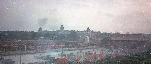 图中的长镜头叫大场面,灰白天光下,车队成排过,烟雾像薄纱一样往远处散,楼顶上的旗正迎风抖开,红色在灰调里提了亮,远远望着都觉得心里有底气。