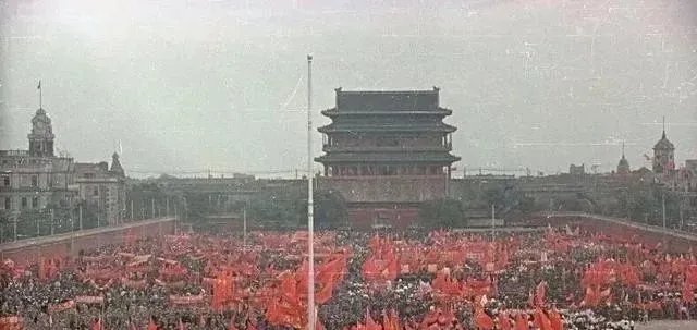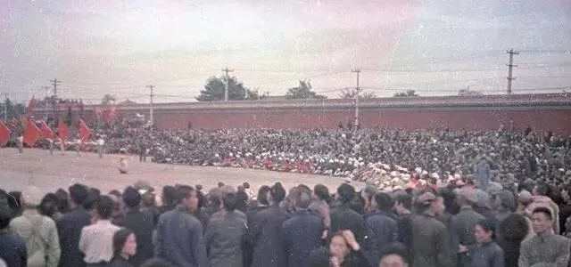 这个开阔视角叫人山人海,红墙外立着旗杆,齐刷刷的队列像方格纸,广场声浪一波一波压过来,像潮水拍岸,站在前排的人把后排的情绪都带起来了。