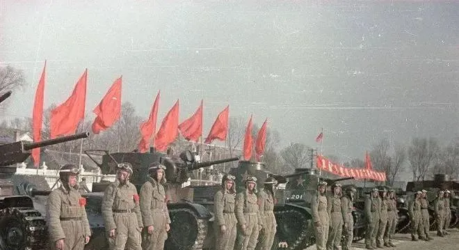 图中的铁家伙叫装甲车,炮口齐齐往前,红旗插在车尾抖成一排,小战士们立在履带边,棉服鼓鼓的,帽檐压得稳,脚跟磕在地上发出清脆的一下,听着就硬气。