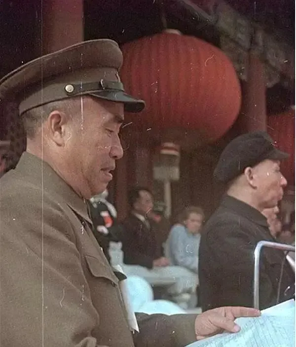 这个长栏杆边的队列叫观礼席,石栏上的葫芦柱子一溜儿排得齐,呢大衣搭配别针勋章,军帽的檐压得正,风从廊下过,衣角抖一抖,大家把目光投向广场中央,谁也舍不得眨眼。