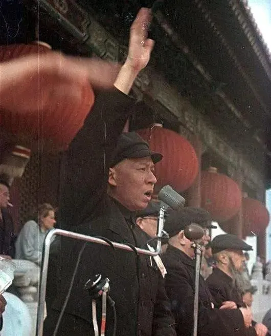 图中这支话筒旁的纸页叫文告,字粒清清楚楚,他微微俯身去看,光从侧面打过来,檐下的红幕像火,声音沉稳,一句句落在广场上,像钉子一样钉住了那一天。