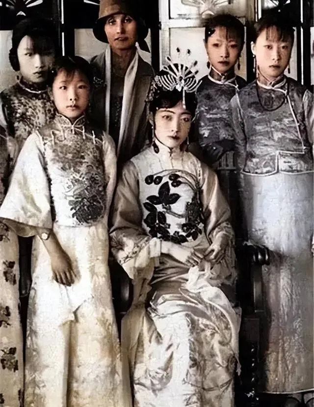 这类合照最考验衣料子,缎面的冷光一铺开,花样就活了,坐在正中的那位端着手,指上戒面圆润,背后的格扇把屋里规矩压住了,妈妈说,以前拍照要“坐住”,别眨眼别抖,一抖就糊了,重来可费钱。