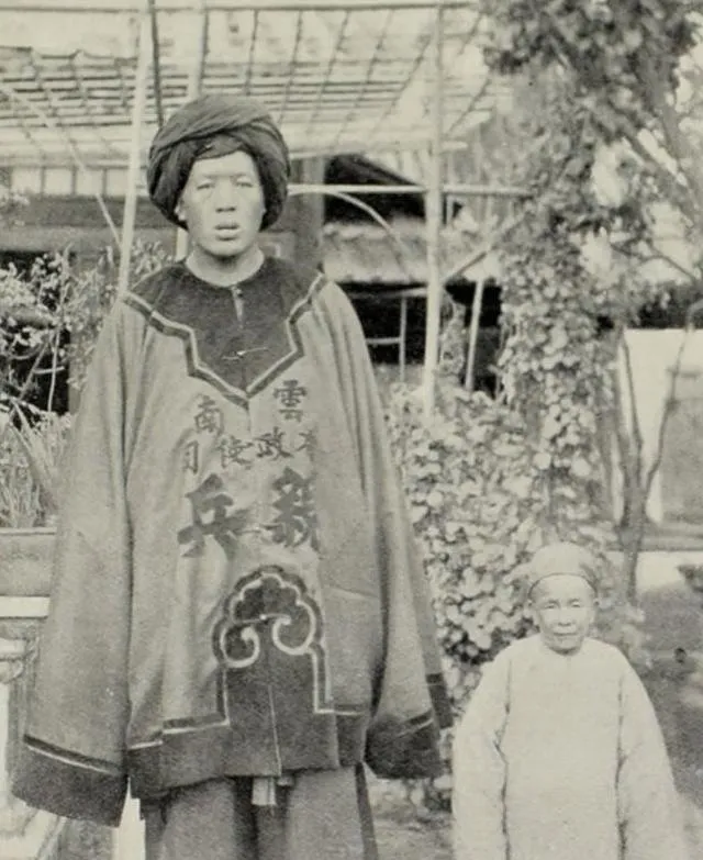 这个高个子穿着兵勇长褂,胸前写着字样,头裹巾,站在院子里像一根旗杆,旁边的老者只到他肘部,奶奶笑他是“一人顶两灯”,走夜路都不怕黑。