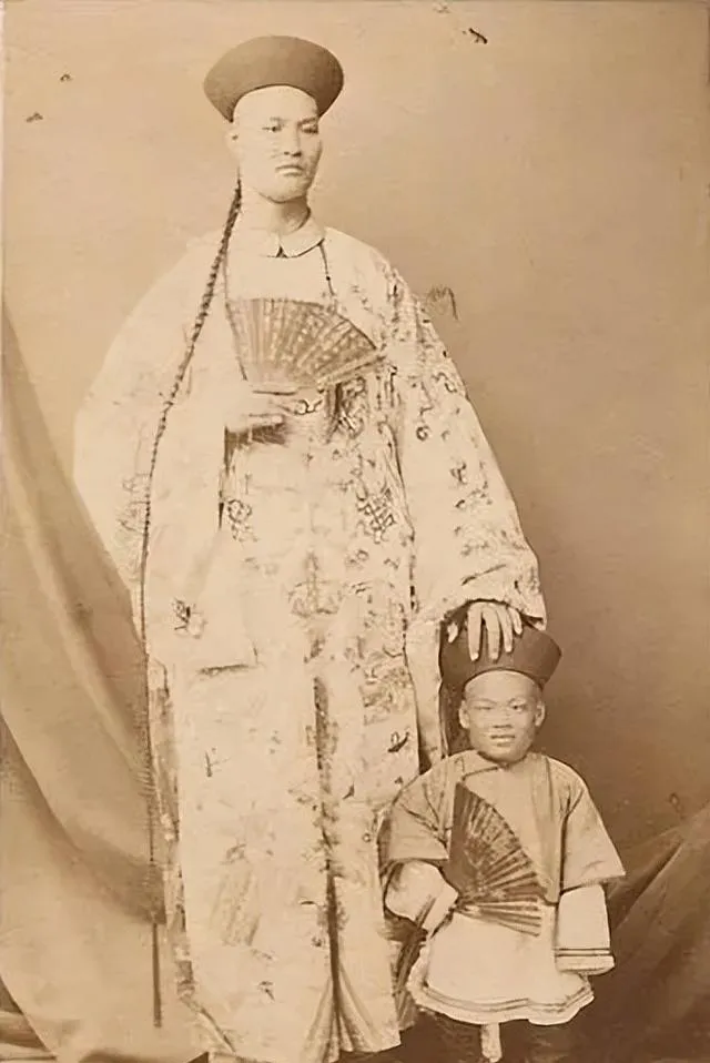 这张更戏剧,个子高的披花缎长袍,手按折扇,旁边的小个儿也托着扇子,帽沿压低,摄影师让两人肩靠肩,一高一矮的悬殊,把时代里的人生起落全显出来了。