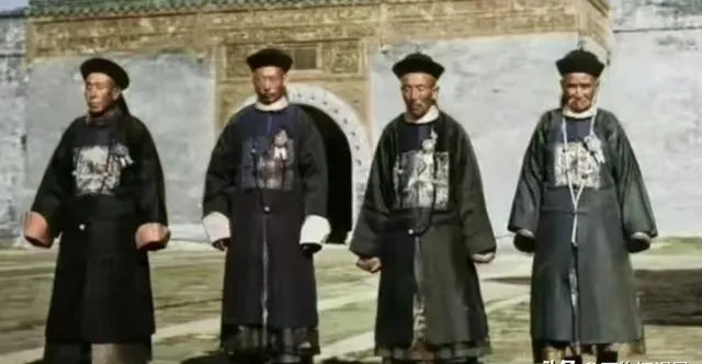 四位官员的朝服宽大,胸口兽补鸟补分品级,袖口肥,脚下厚底靴,站在宫门前不苟言笑,哥哥打趣说,别看衣服体面,里子多半打着补丁,朝里向来节俭的多。