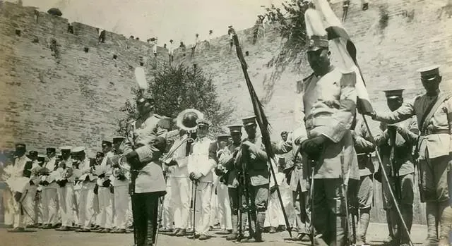 这支队伍里有洋兵,前排拿着大号,帽子高耸,后排持枪列队,城墙把回声兜住,声音一冲,满城皆闻,新鲜而陌生。