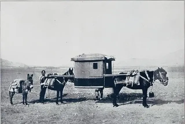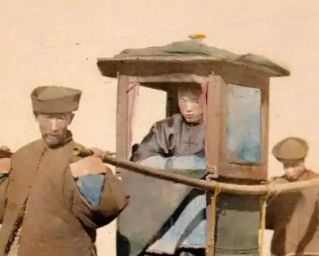 一个是肩挑小轿,木杠压在轿夫肩窝里,另一张是双马抬轿,车轿合体,走得稳,妈妈说,坐轿不如走路快,走路不如有驴省力,挺实在。
