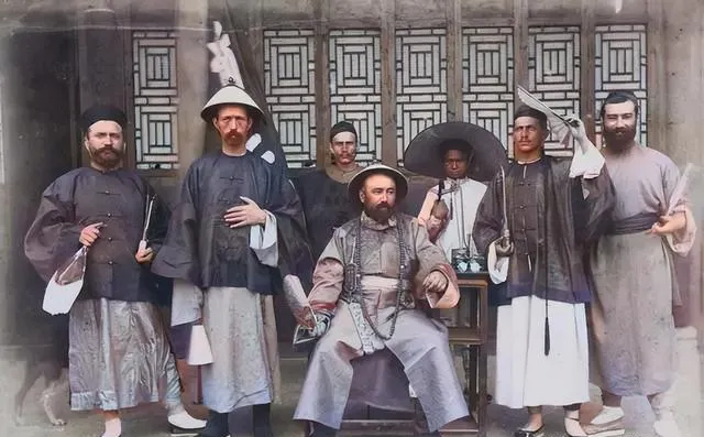 居中那位官儿坐太师椅,两旁洋人分立,桌上摆印盒和卷宗,窗格是冰裂纹,大家表情都很克制,合影是姿态,也是宣告。