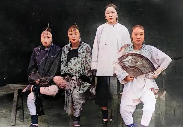 发髻高,刘海平,裤脚收得利索,坐在长条凳上,一位把扇子横在膝上,眼神直直,像要从相纸里走出来,狠劲儿与俏劲儿凑在一块儿。