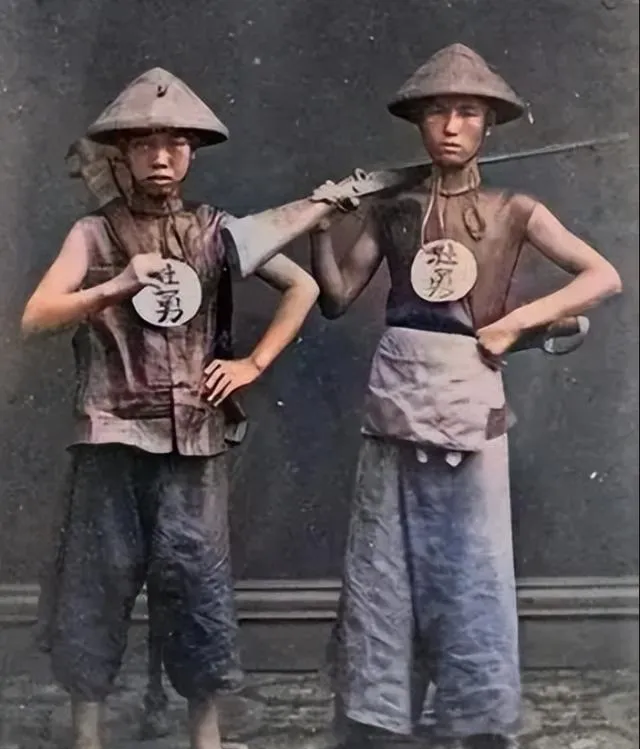这张里一个穿红缎斜襟,一个头顶斗笠,腰间挂刀,眼神却拘谨,像被人突然叫住拍了一张,照片边角能看到旧影棚的幕布毛边,仓促里的认真很动人。