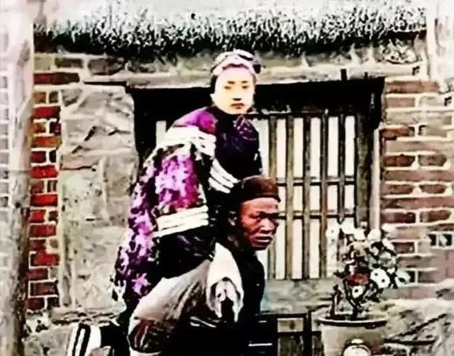 白坎肩配紫边滚线,坐姿端,鞋底厚厚,套着白袜,眉眼坚毅,那股不服输的劲儿从眼睛里往外窜。