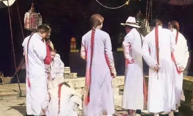 一队人扎着长辫,白袍随风摆,摊位上挂着串串货,辫子在风里甩出弧线,像旧时光最后的标记,剪与不剪,全是故事。
