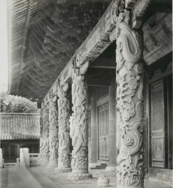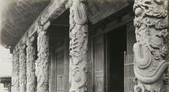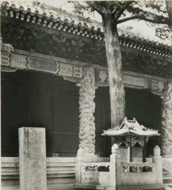 这个盘着云龙的立柱就是大成殿的龙柱,石头是温润的灰白,龙爪抓着云头,抬头就能看见昂起的龙鼻,殿前一座小小的覆钵香亭,像个“缩小的屋顶”,老照片里光影打在柱子上的那种细腻,啧,越看越有味道。