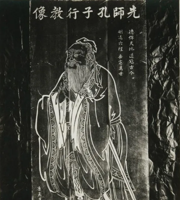 这幅黑底白线的画叫先师行教像石刻拓本,衣纹一层套一层,线条干净不拖泥带水,旁边那四句赞辞字字落地,奶奶指着“德侔天地”说,这四个字压得住。