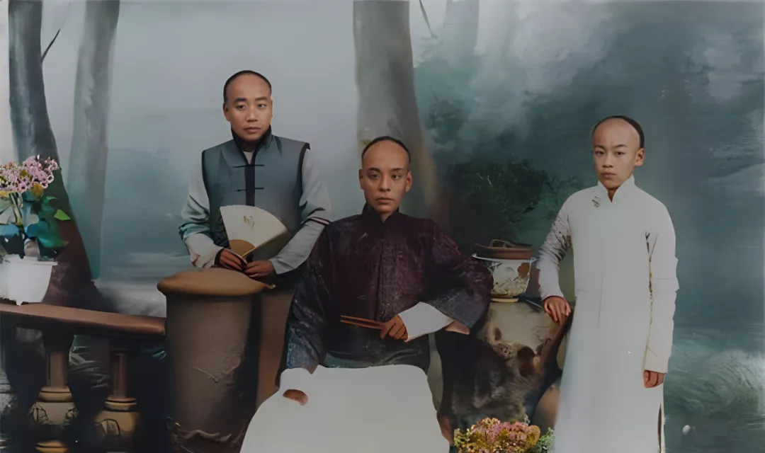 图中这位正中而坐的叫少爷,穿的是暗紫绸缎长袍,袖口露白,右手夹着折扇,扇骨发亮,旁边的两位是随从打扮,一个握扇一个垂手,衣料都挺括,立领贴得紧,后景是影棚里常用的山水布景,看着清清冷冷却把主人的身段托得很直,奶奶看这种照片老爱嘀咕一句,人得靠一身行头撑气派,可也得坐得住才不露怯。