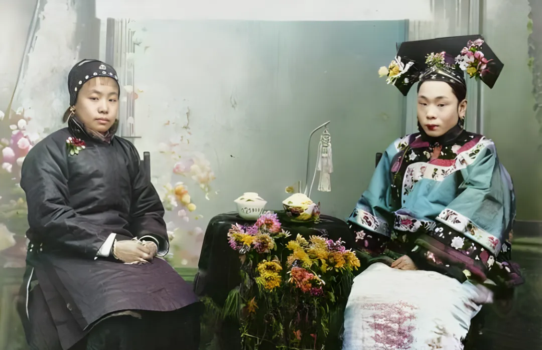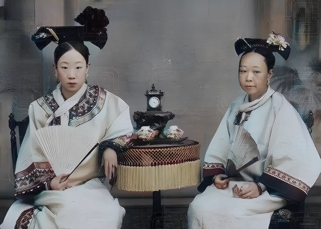 这个场景叫两位妻妾同坐,一左一右,桌上摆钟与小果盘,都是讲究物件,左边的小妾年纪轻,团扇遮在胸前,眼神直直地看着镜头,右边的正妻眉目沉稳,袖口绣边厚实,奶奶说,坐照片的时候位置最讲究,谁靠近小几谁坐正,谁的花钿更醒目谁就不敢多笑一分,现在看着像摆拍,那会儿全是礼数。