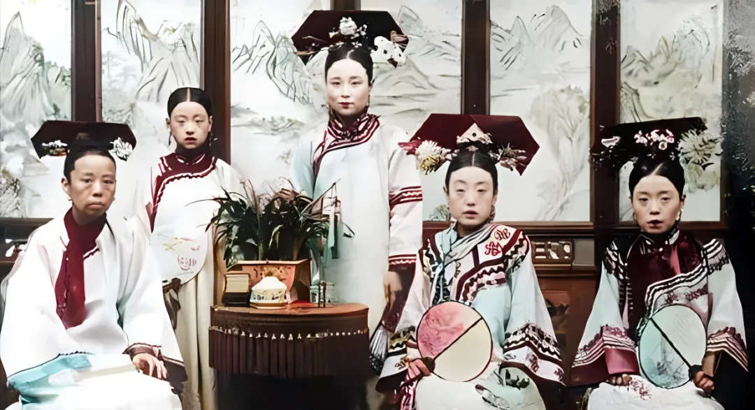 这张合影人多,站中间的那位个头拔高,袖子宽,肩下坠着坠穗,左右两边的姑娘手里都拿着团扇,颜色分成三块,像小彩饼,桌上摆的是盆景与木盒,边缘挂穗子,小时候我见过类似的挂穗,摸起来滑溜溜,轻轻一拂就挪到另一边去了,妈妈说,那会儿主子家连桌裙都得找人绷平缝齐,褶不齐就得拆,体面是做出来的不是喊出来的。