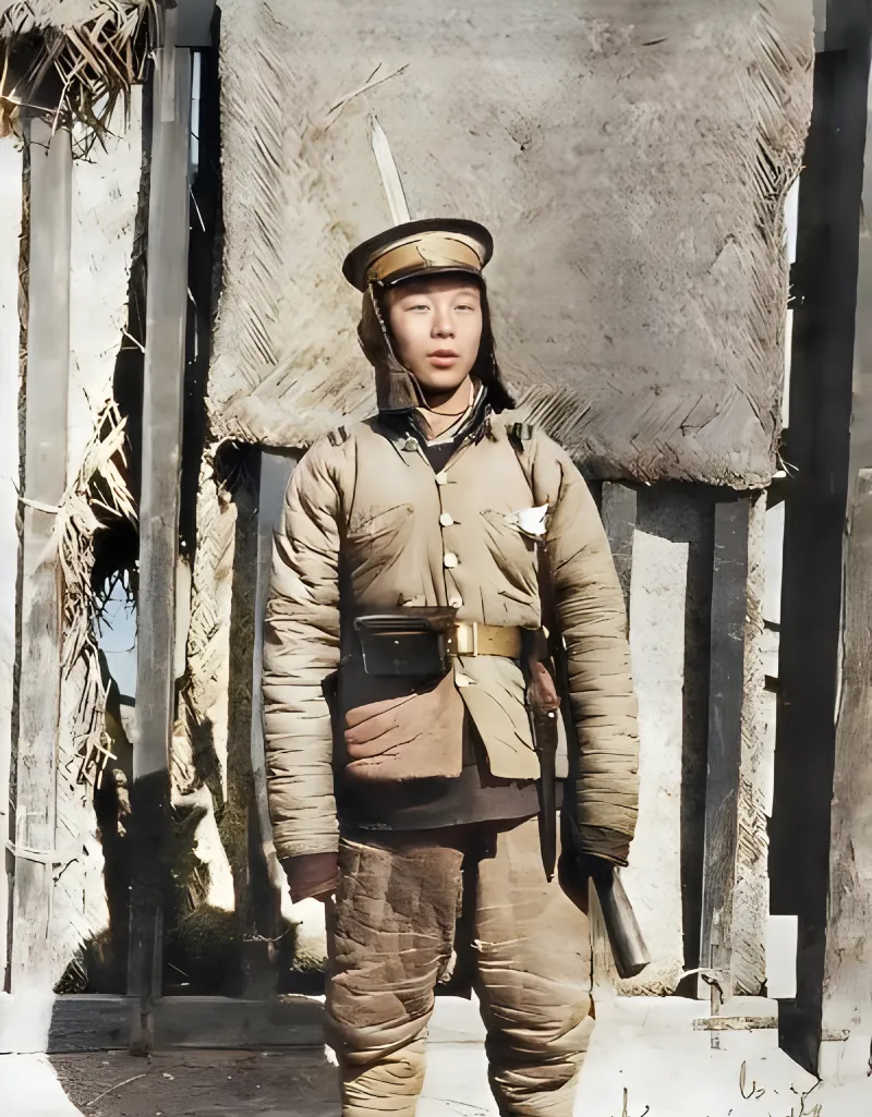 这个年轻人叫新军士兵,棉军装鼓鼓囊囊的,腰间一条皮带勒得紧,帽子前翘,顶上插着白羽,耳边还垂一块护耳,手里握着的是号筒还是短棍,一时也看不真切,背景是茅草和木桩搭的哨所,缝隙里能透光,风从那儿穿过就会“呜”的一声,妈妈说,冬天站岗最难受,脚底先冻,得把鞋垫往火上熏一熏再塞回去。